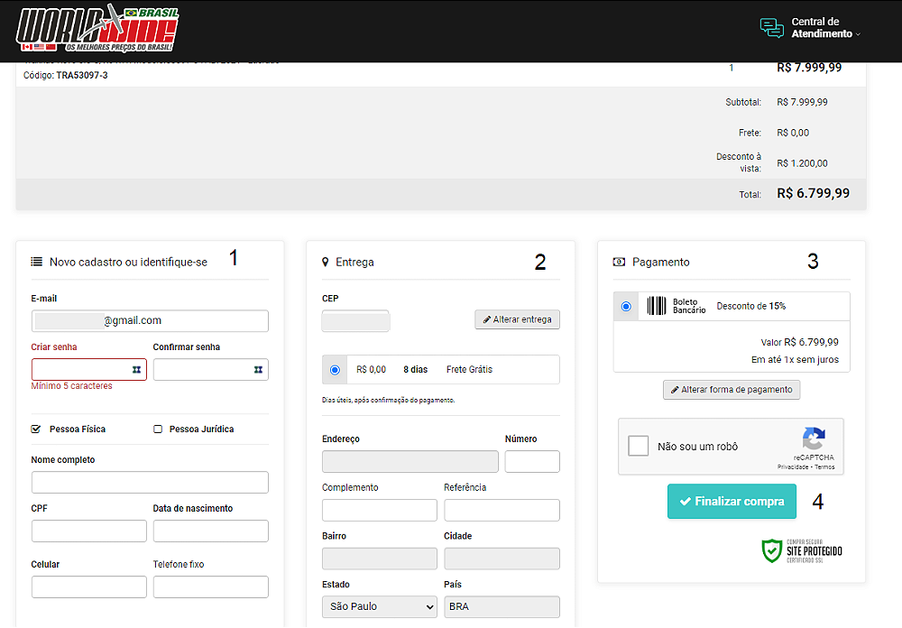 4- Neste exemplo estamos comprando um produto físico. Sendo assim vamos realizar o passo 1, 2 e 3 conforme abaixo;